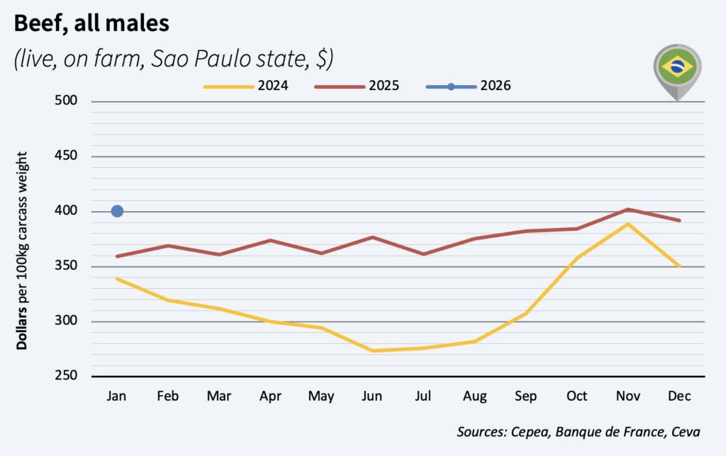 Brazilian beef prices increased by 2% in a month in January, and were above early 2025 level in US$ (+11%) but not in Réais (-1% year-over-year). Beef production increased by 4% in 2025 (estimates) and exports bounced up by 21%, including to China and Hong Kong: +24% at 2.2 million tons cwe. Even though China has put a 55% tariff on exports above 1.1 million tons from Brazil, the country sent 160.000 tons cwe to China-Hong Kong in January, 30% above last year’s level! Brazil also shipped 57% more meat to the US in January y-o-y and 25% more to the Middle East, confirming its ability to expand across diversified markets.