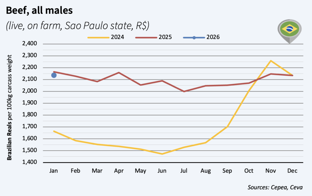 In a month, January beef prices rose by 2% and stood 23% above early 2025 levels, though still below their 2024 peak. Chinese prices remain just below Brazilian levels, as large inflows of Brazilian meat imports continued in January (+30% to China-Hong Kong). According to Chinese meat distributors, China imported a record 4.03 million tons cwe of beef in 2025 (+6% year‑on‑year). China also implemented safeguard measures on beef imports, with a 55% tariff volumes exceeding the global quota of 2.7 million tons per year. In January, Brazilian beef exports to China were still surging, up 30% y-o-y.