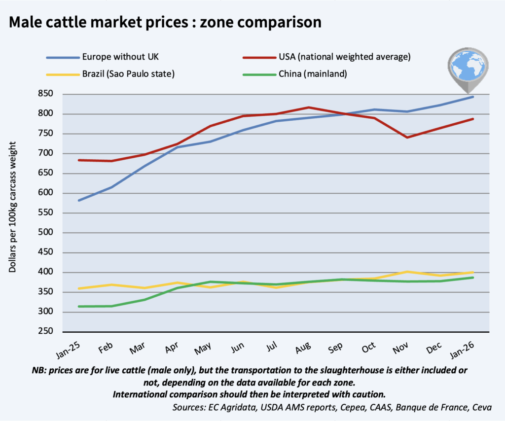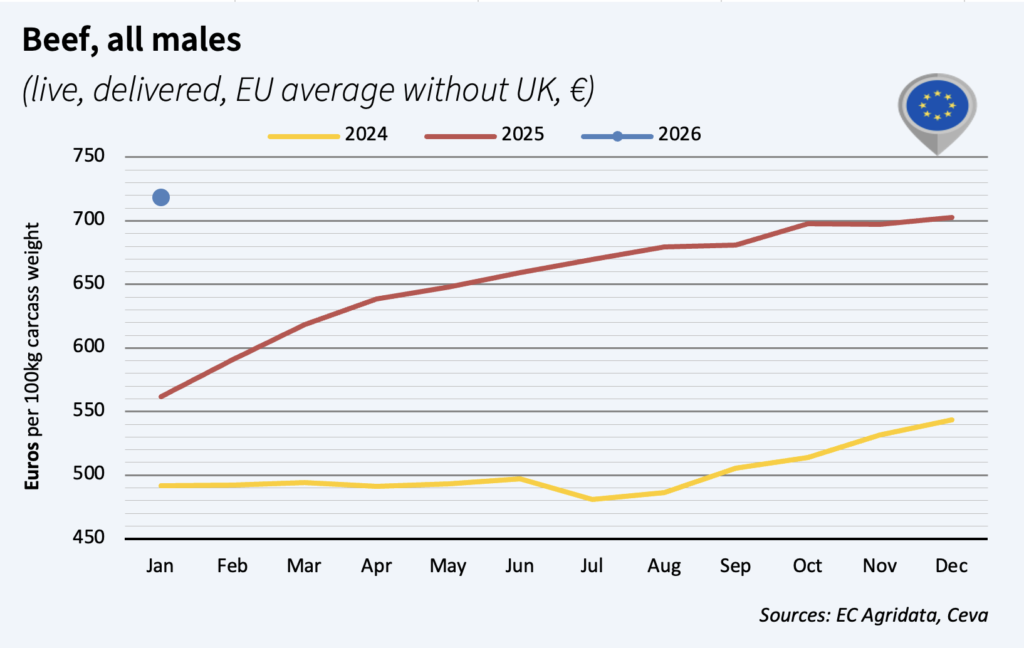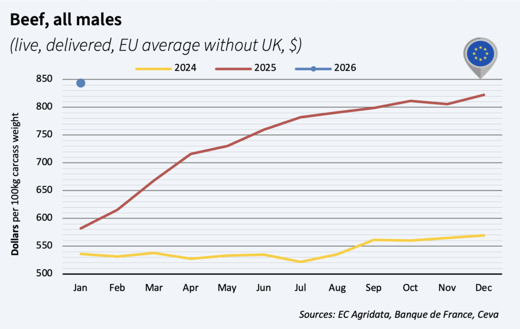 January male carcass prices continued to rise, with a 3% gain in a month, and standing 45% above 2025 levels! EU beef production contracted by 4% for 11 months in 2025, bringing slaughterhouses to often add a few $ to male prices. This trend could continue in 2026 with cattle herd at low levels.