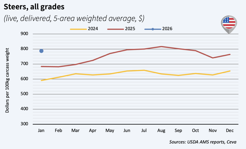 Prices fell in the autumn, after record high prices, but have almost recovered since. January steer prices were up by 3% in a month and 15% above 2025 high levels. Preliminary USDA data says beef slaughtering decreased by 4% in 2025. The US cattle herd, historically low, was 0.4% down year-over-year in January 2026. Beef cow numbers decreased by 1% y-o-y but beef heifers were up by 1%, which may increase the total herd and beef production in the next few years. US beef meat imports were up by 7% in January y-o-y and the US government multiplied by 5 the free-tariff quota for argentinian trimmings, to ease pressure on retail prices.