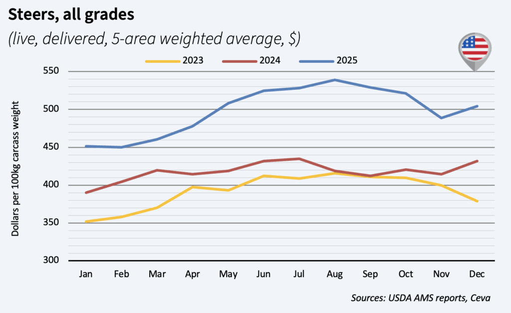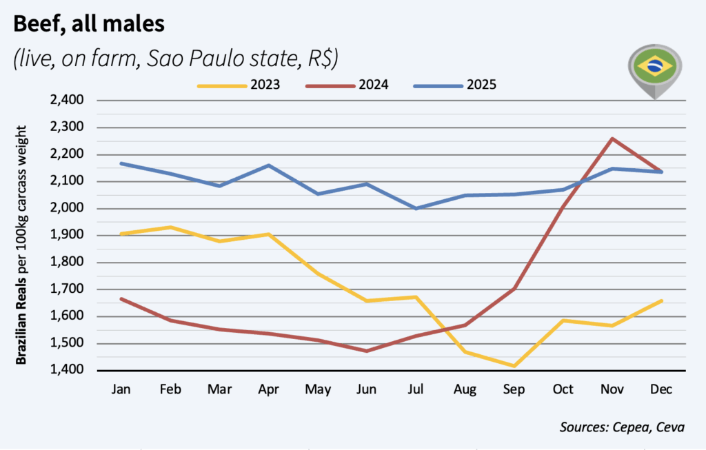 In December, Brazilian beef prices decreased by 3% in a month but are above 2024 level (+12%). Beef meat production has increased by 4% in 2025, according to latest estimates. The country’s total beef exports during 2025 culminated at a historic 4.145 million tons cwe, 21% above 2024, already huge. Exports to China (& Hong Kong) were of 2.2 million tons (+24%) and will be curbed in 2026 as China put a 55% tariff on all major exporting countries to its territory, above a maximum quantity exported from each country (safeguard measures). The limit for Brazil is 1.1 million tons. The country will probably send more beef to Japan, Korea, the Philippines or Indonesia, and the US.