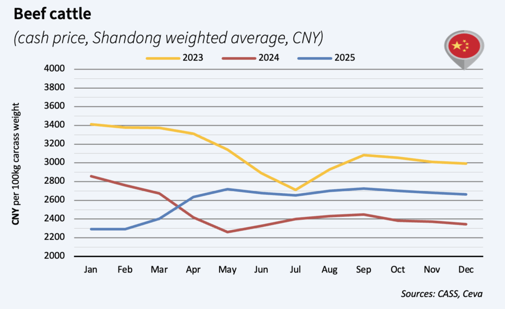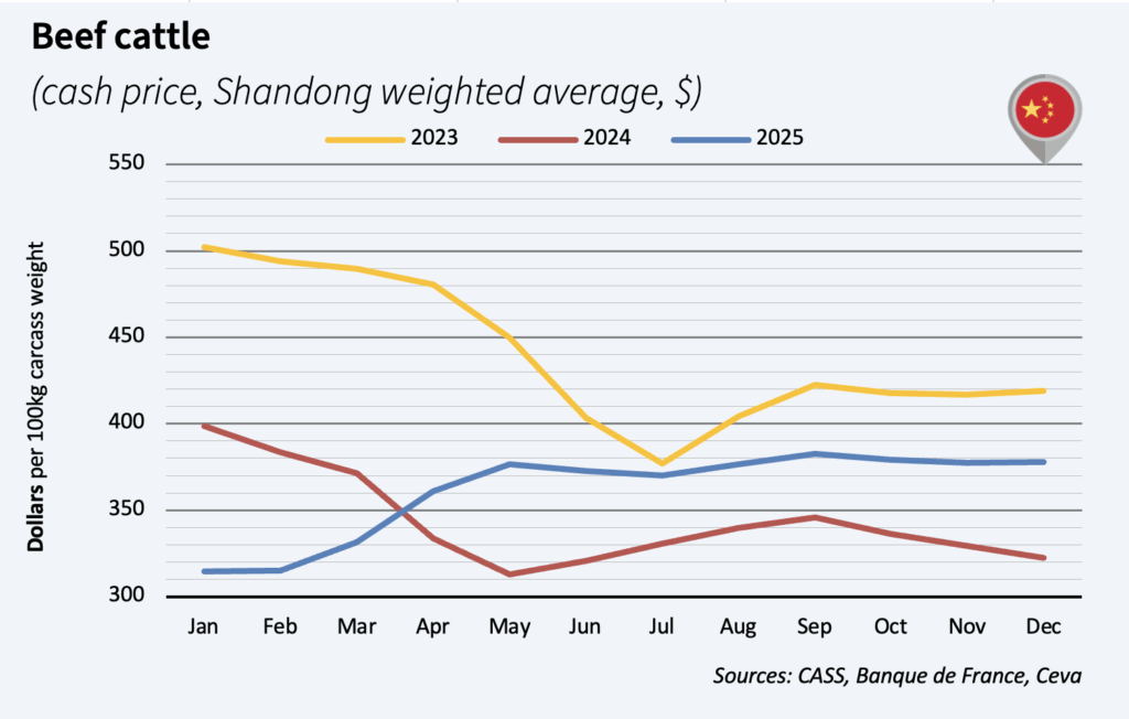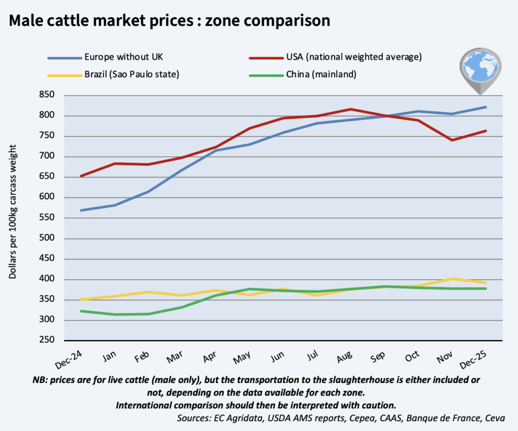 In December, beef prices stayed stable at a low level and just underneath brazilian prices, as meat imports continued. Nevertheless, prices were 17% above 2024 low level. China’s main meat furbishers say they sent a record 3.68 million tons cwe of beef to China in the first 11 months of 2025 (+6% year-over-year). China released its safeguard measures on beef imports, with a 55% tariff on extra volumes above a total world quota of 2.7 million tons of beef imported yearly, with individual quotas per origin. This should curb imports and help the local cattle industry.