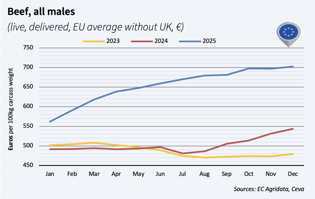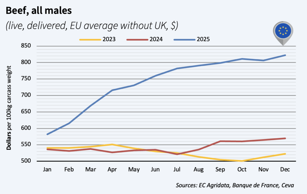 In December, male cattle prices, already at record levels, continued increasing by 2% in a month and were 44% above 2024 high level. EU beef production contracted by 3% in the first 10 months of 2025, making meatpackers scramble for cattle, adding every week a few $ to the male prices. This trend could continue in 2026 as cow herds are low. However, consumer’s willingness or not to buy, may be a difficulty.