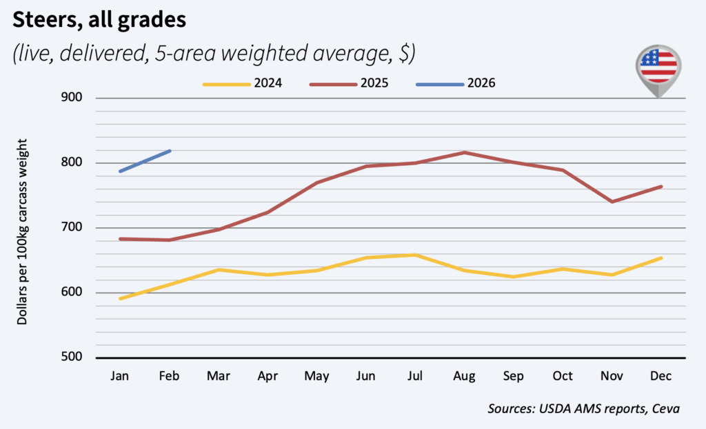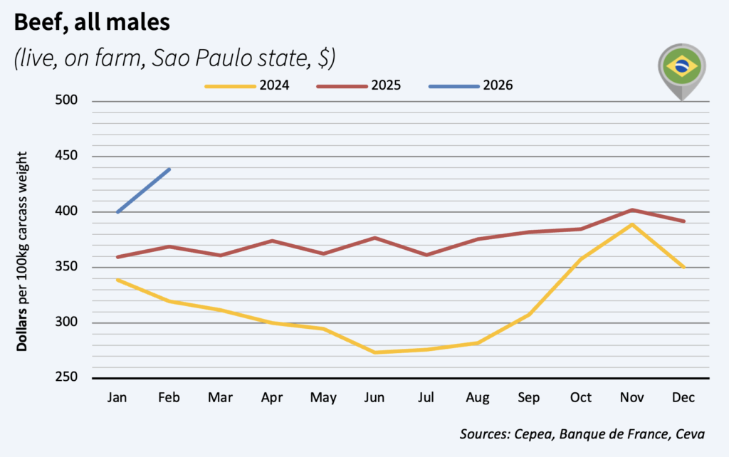 Brazilian beef prices surged in February, rising 10% from the previous month and 19% above 2025 levels in U.S. dollars (+7% year-on-year in Reals). Strong global demand is supporting prices. Exports reached 627,000 tons cwe in January–February 2026, up 25% from the 2025 record. China and Hong Kong imported 299,000 tons cwe (+21% year-on-year) despite China’s new cap on tariff-free imports at roughly half of last year’s volume. Brazil also diversified its markets: shipments to the U.S. rose 51%, exports to other North American countries increased 55%, volumes to the Middle East grew 22%, and exports to Egypt more than doubled. However, the conflict in the Middle East may disrupt regional shipping routes.
