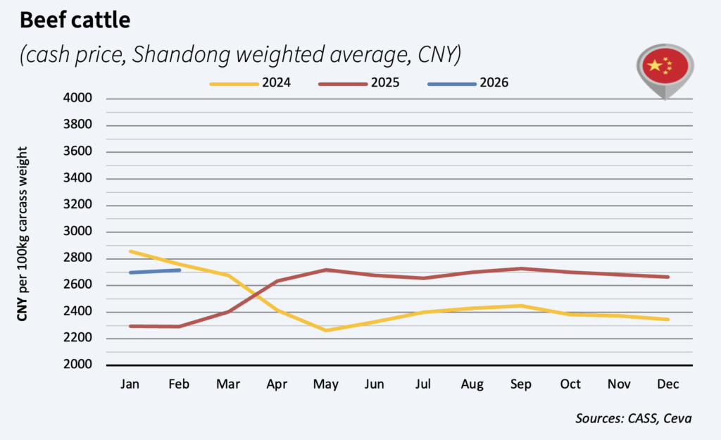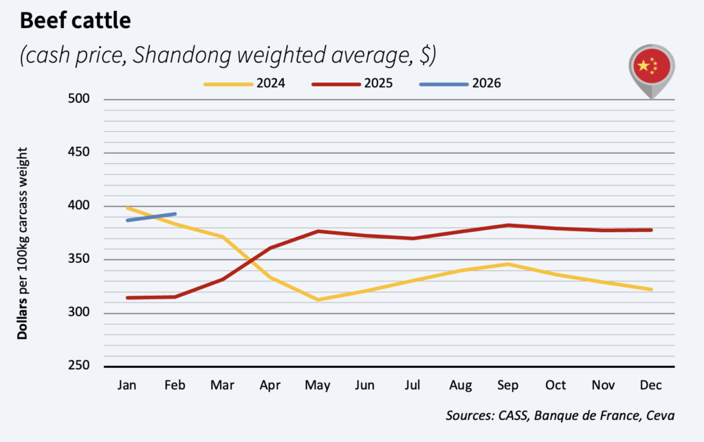 China beef prices rose by 2% in a month and were 25% above early 2025 prices, slightly above 2024. Prices are lower than Brazilian prices since November, as massive meat imports continued in February from Brazil (+12% to China-Hong Kong). China’s meat furbishers sent 261.000 tons cwe of beef to China in January (stable y-o-y). China released its safeguard measures, with a 55% tariff on extra beef import volumes above a total world quota of 2.7 million tons yearly.