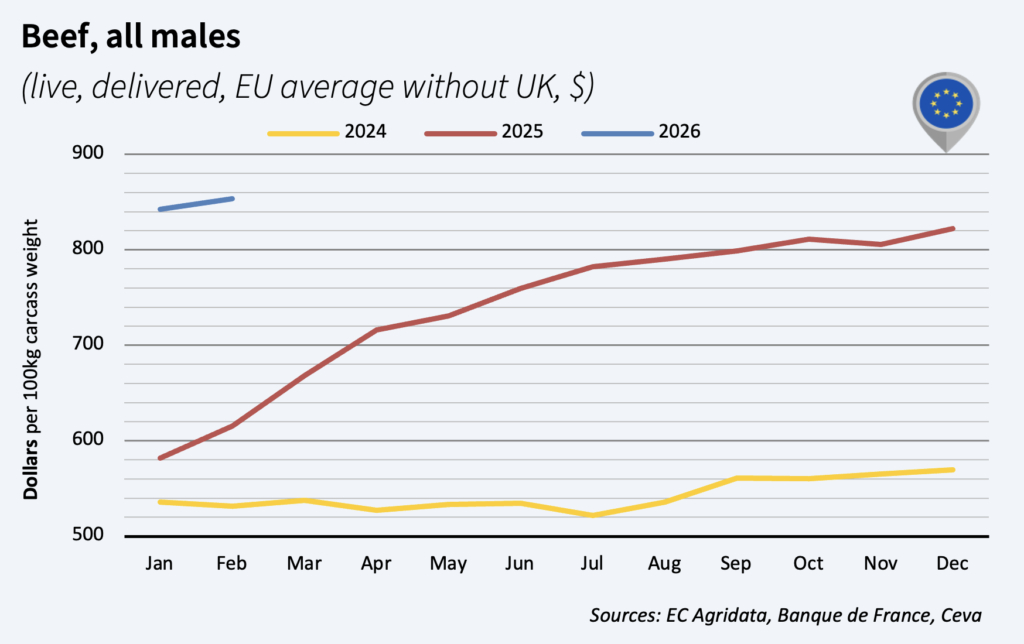 In February, male carcass prices rose by 1% compared with the previous month and stood 39% higher than in 2025. Early March saw a slight decline as consumption eased. The reduction in slaughtering is expected to persist in 2026, given that the population of 1–2-year-old males was already down by 1% year-on-year in December 2025.