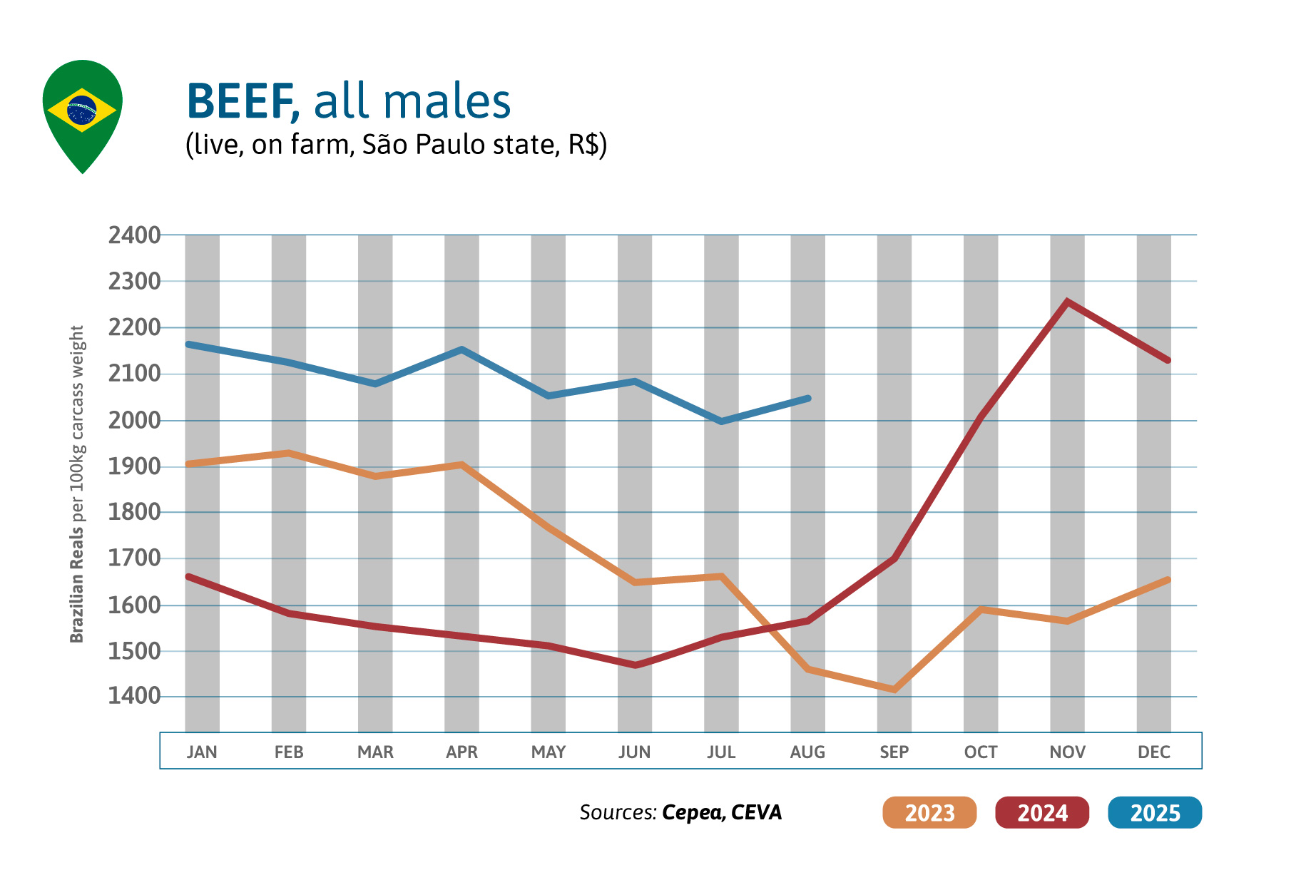In August, Brazilian prices were globally stable at high level for the country, while Chinese prices were equivalent to that, which means still quite low. US prices are increasing as cattle is kept longer on feed with the ban on Mexican bovines. In Europe, prices are much higher and still increasing, from global lack of volumes.